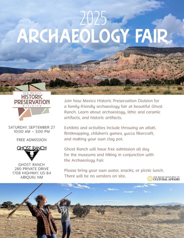 The 2025 Archaeology Fair will be held in partnership with Ghost Ranch at Ghost Ranch, Abiquiu, from 10:00 am – 3:00 p.m.